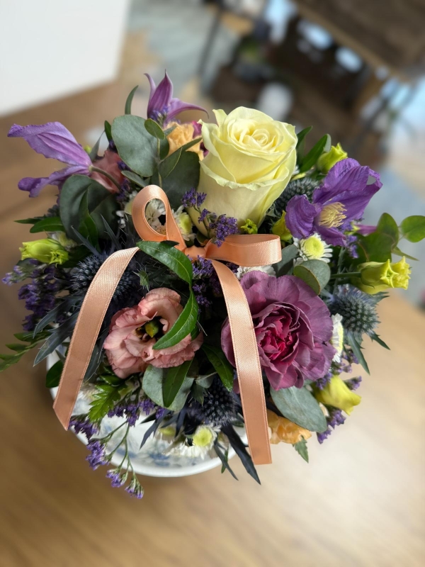 Featuring a graceful blend of roses, lisianthus, and complementary textural flowers, this arrangement is finished with a satin ribbon for an extra touch of sweetness. Its compact, decorative design makes it perfect for a windowsill, bedside table, or favourite cosy corner.