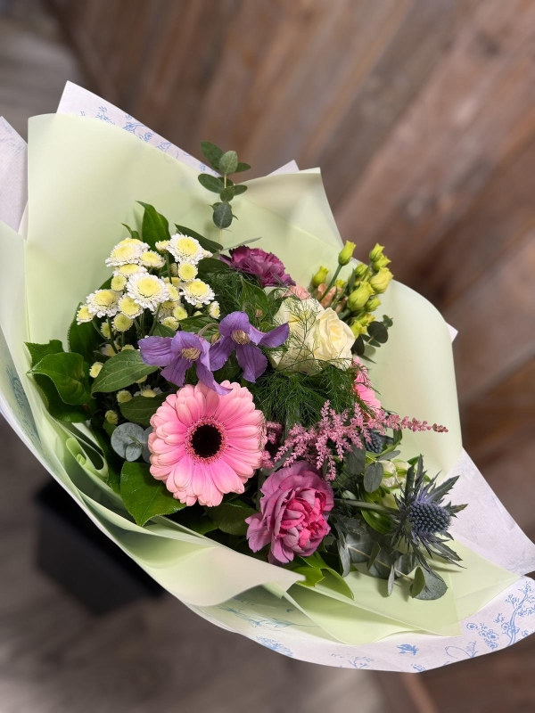A timeless and elegant choice, our Classic Wrapped Bouquet is beautifully arranged with a soft blend of pinks, purples, creams, and fresh greenery. Featuring seasonal favourites such as roses, gerbera, carnations, and delicate filler flowers, this bouquet is thoughtfully hand tied and wrapped in stylish kraft paper.